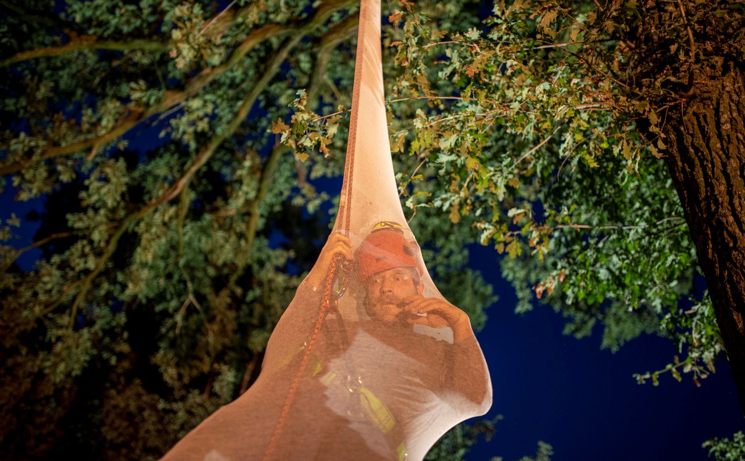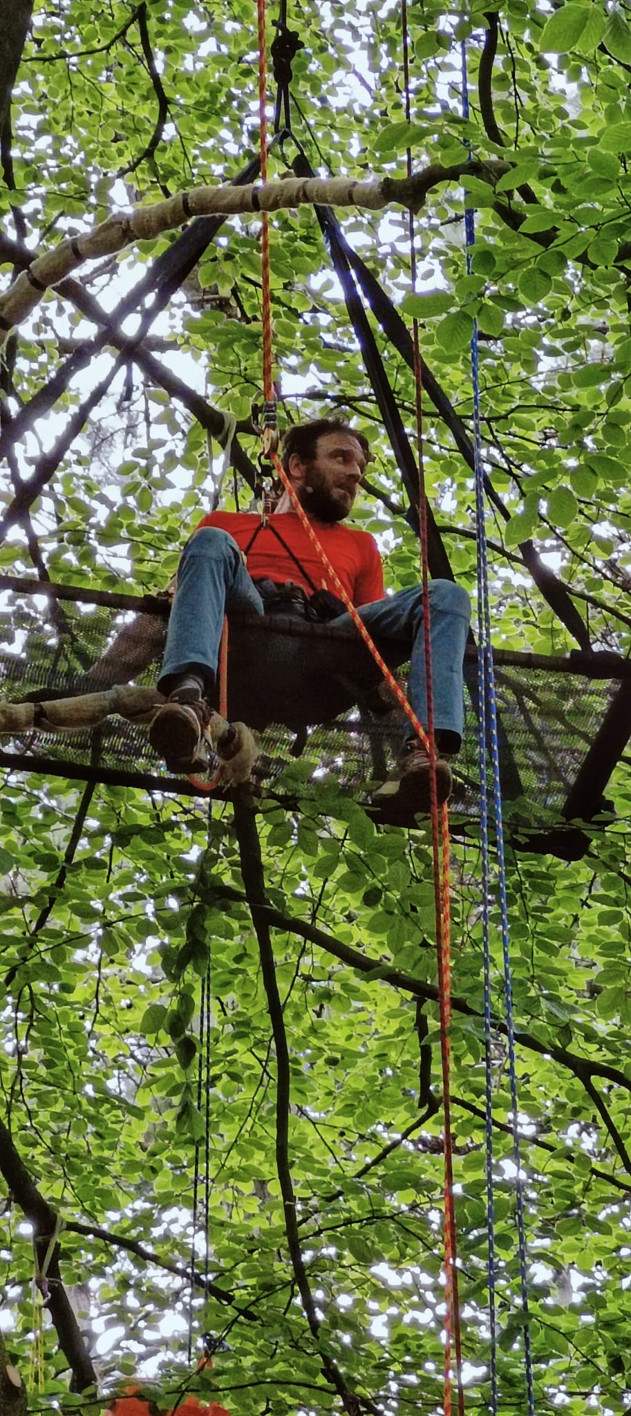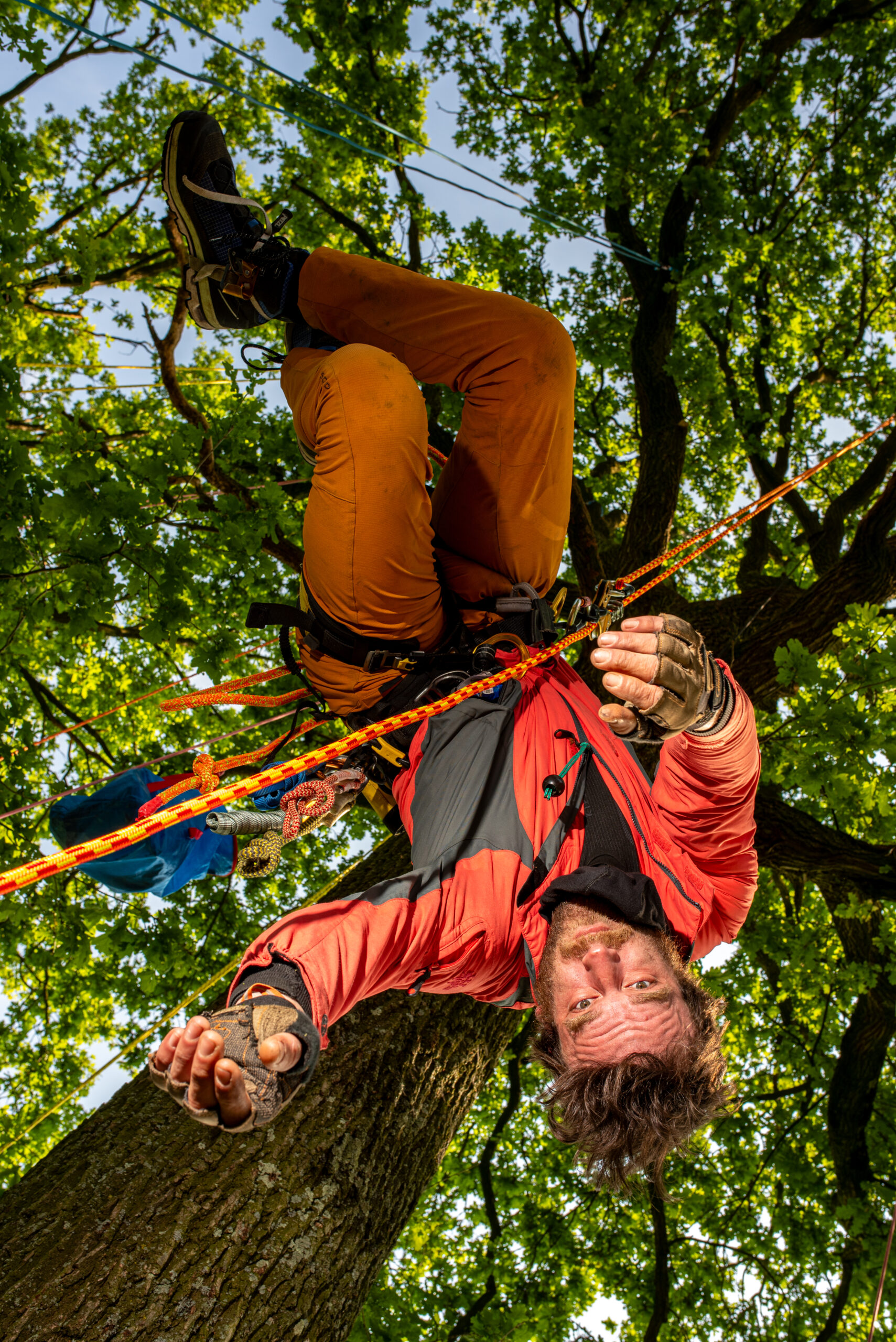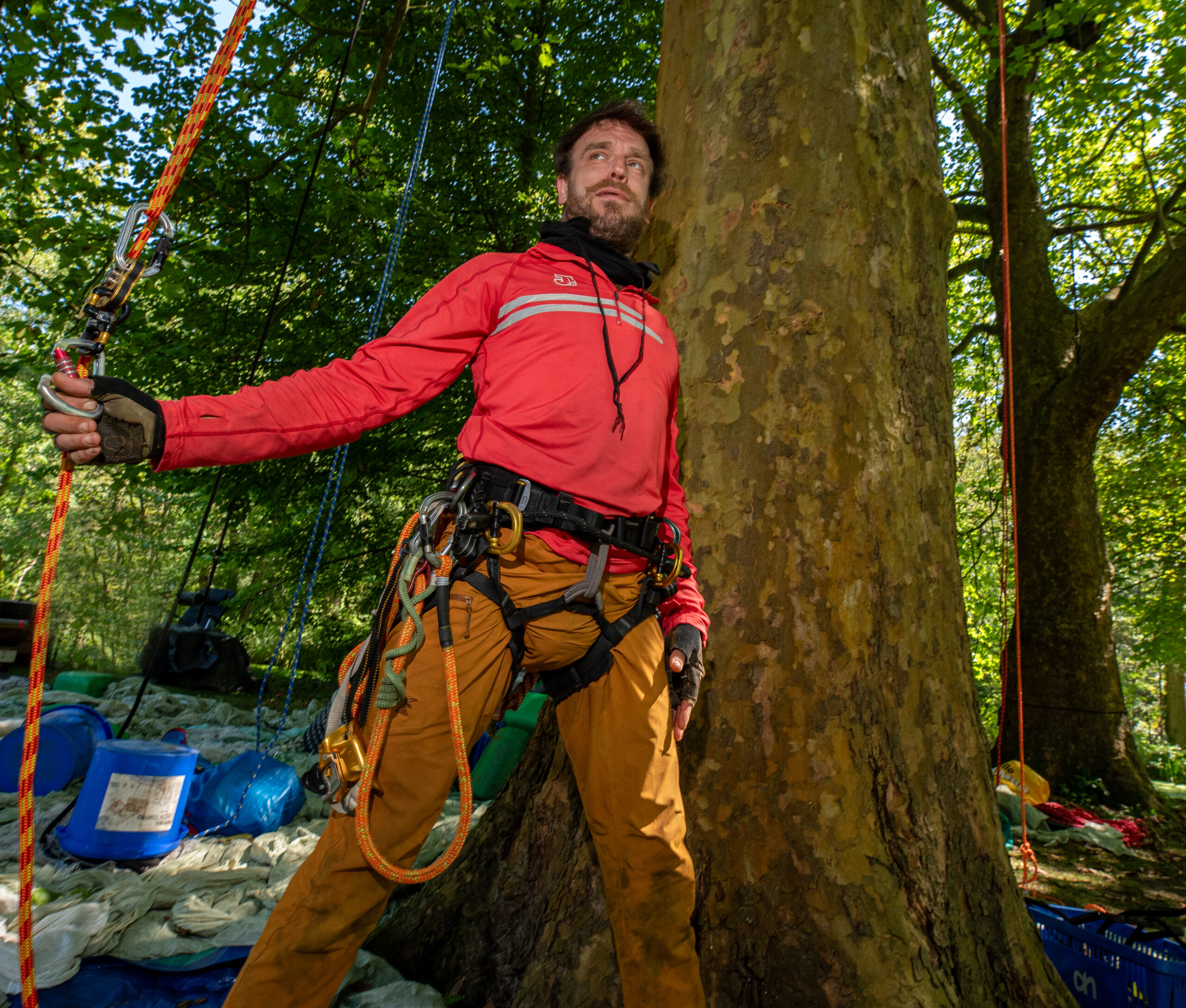 Hij weet niet meer precies hoe lang hij er al zit. Wel weet hij nog dondersgoed waarom. Ook al is de rest allang vertrokken. Hij is hier nodig. Hij moet dit doen. De volhardende activist die als enige overbleef in een poging om het bos om hem heen te redden. Toch waait het hard als je niet meer uit de wind gehouden wordt.