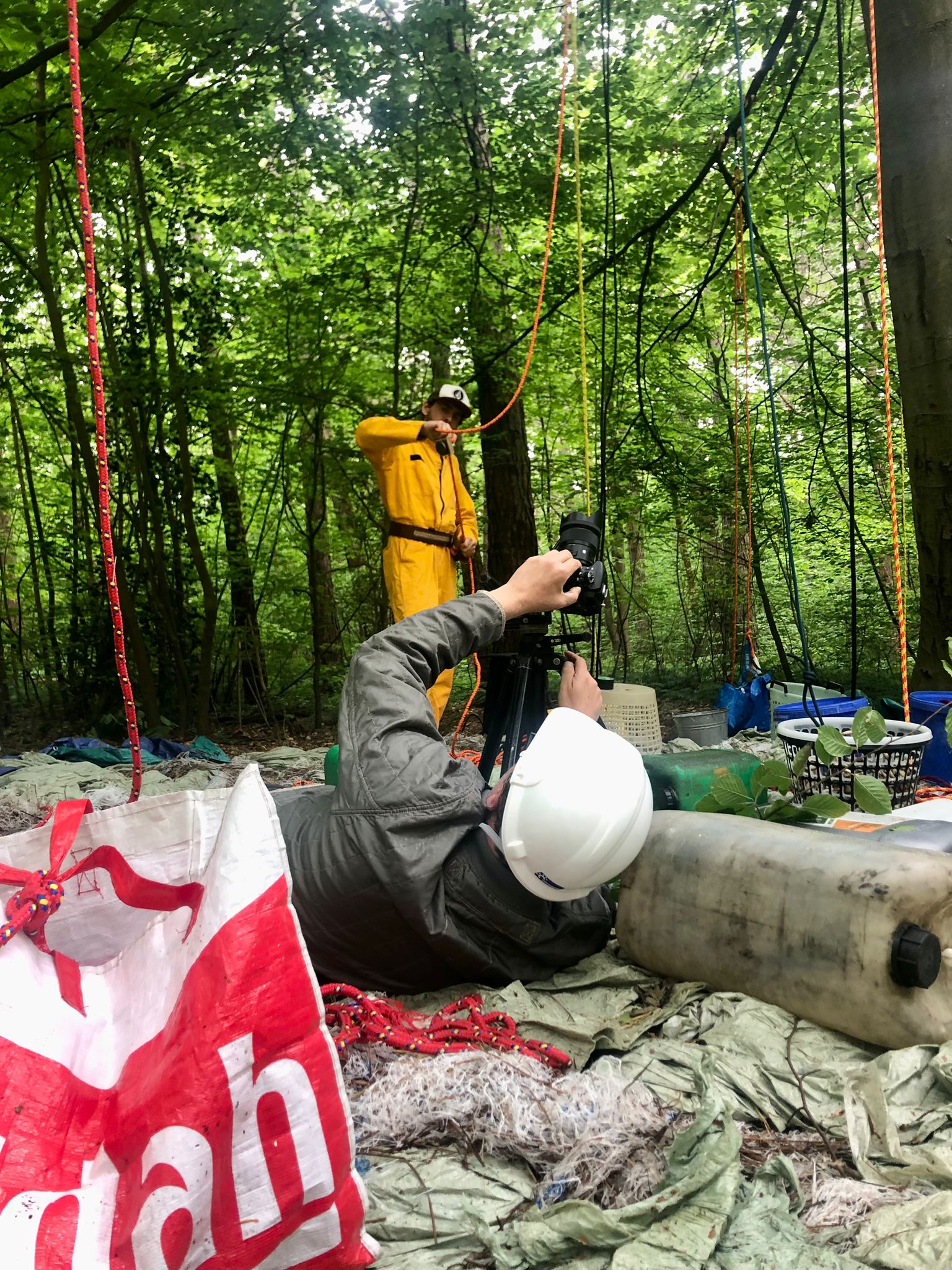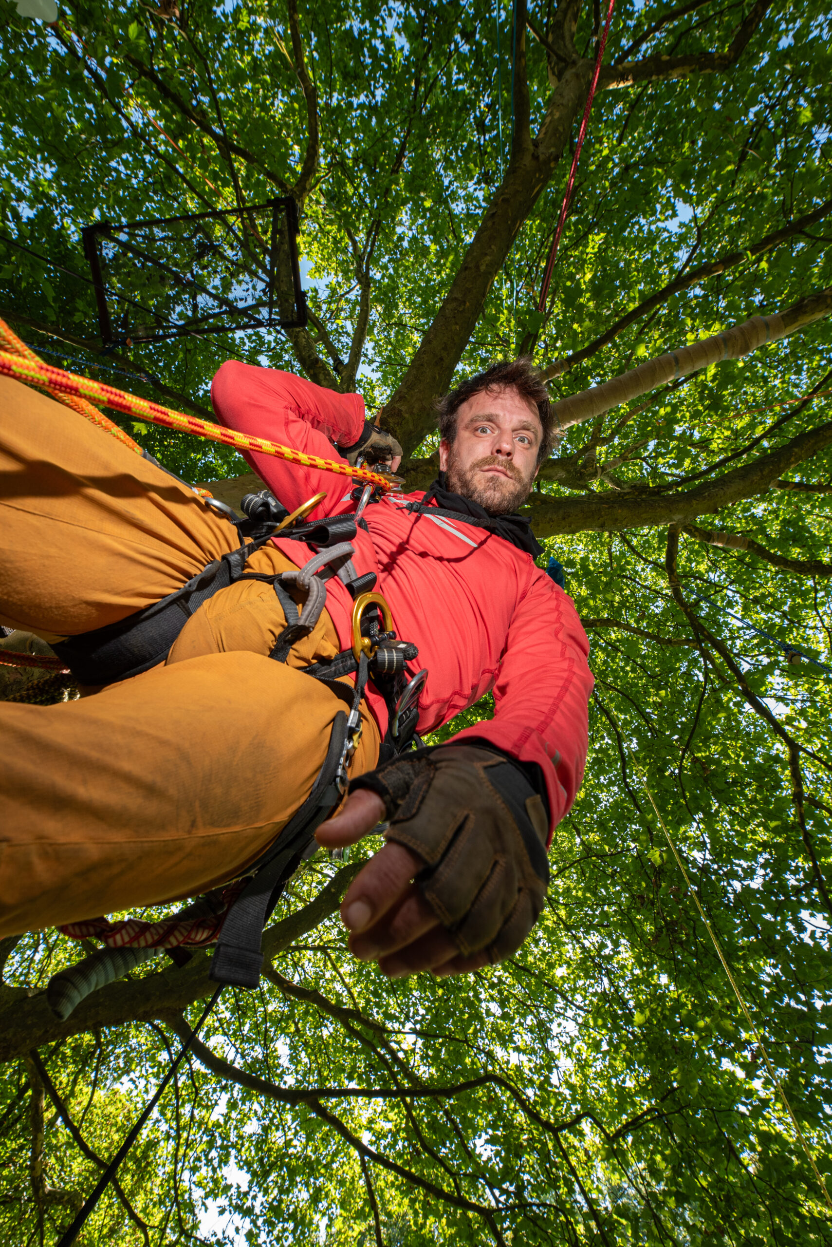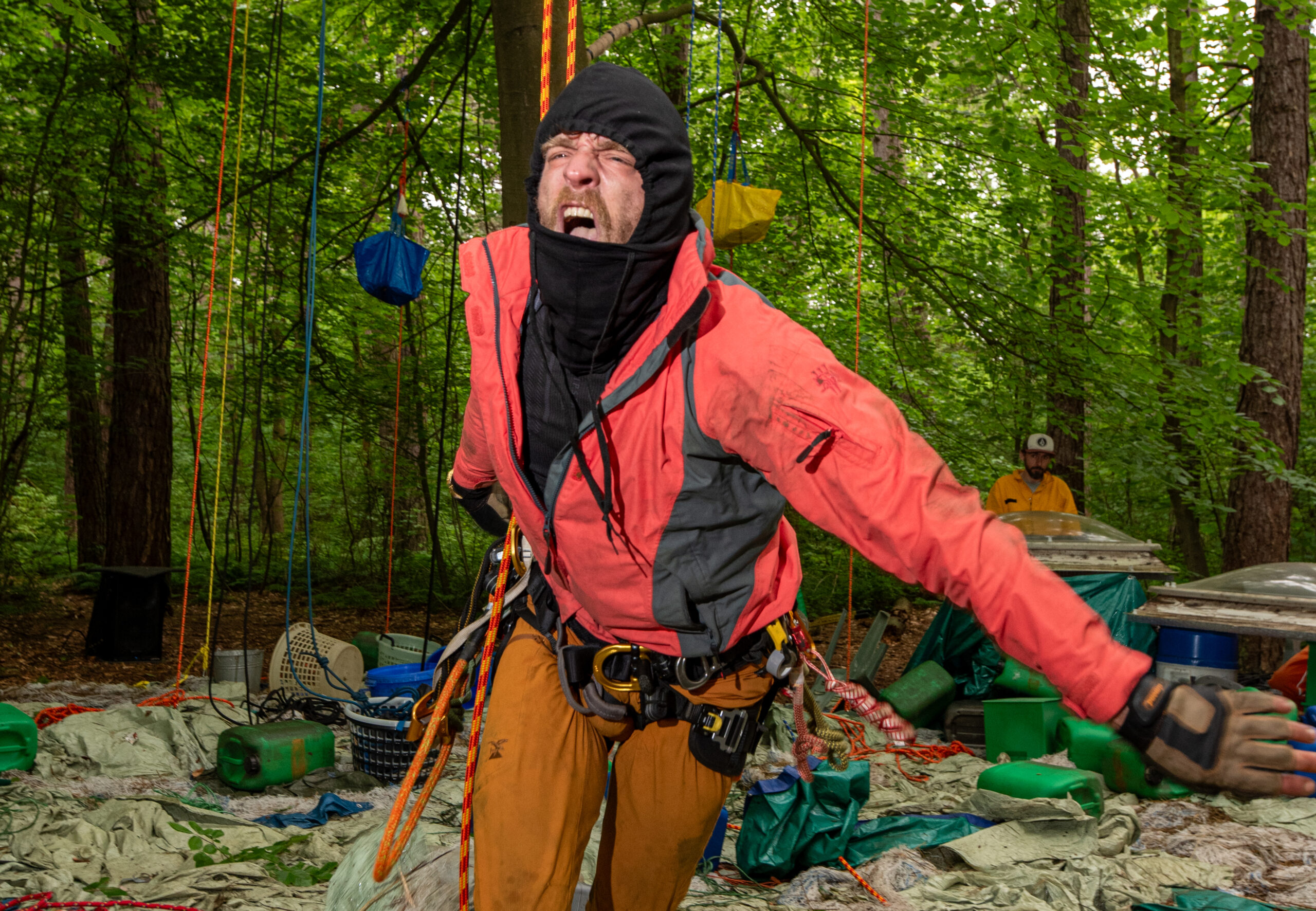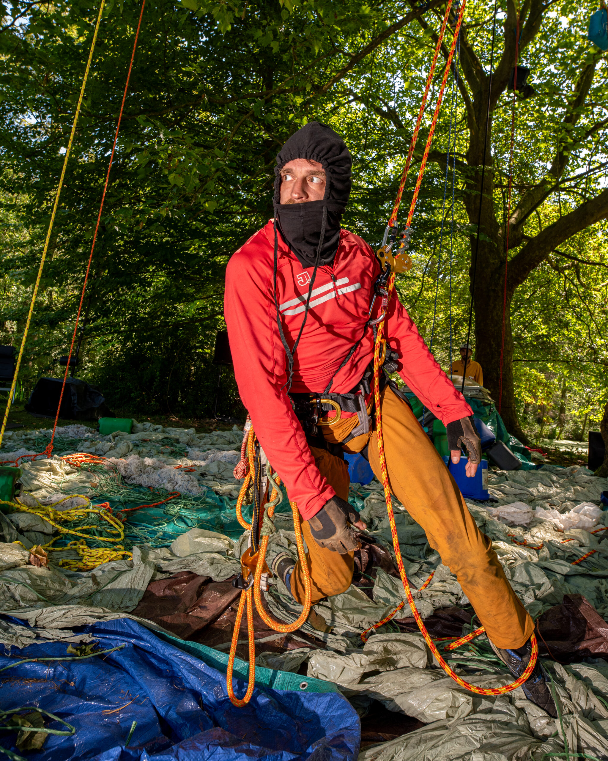 Hij weet niet meer precies hoe lang hij er al zit. Wel weet hij nog dondersgoed waarom. Ook al is de rest allang vertrokken. Hij is hier nodig. Hij moet dit doen. De volhardende activist die als enige overbleef in een poging om het bos om hem heen te redden. Toch waait het hard als je niet meer uit de wind gehouden wordt.